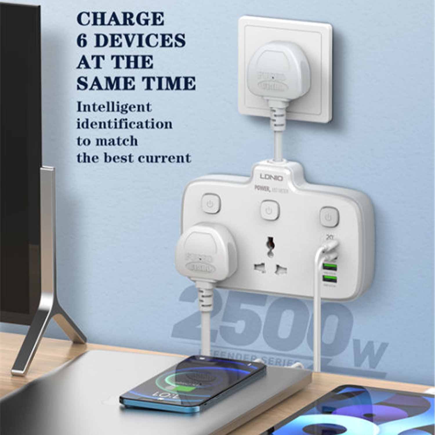 With a total power capacity of 2500W, the SC2413 is ideal for both residential and commercial use. Its built-in night lamp adds gentle illumination, perfect for bedside or office setups. The LDNIO SC2413 Power Socket is designed with safety in mind, offering surge protection, overheat prevention, and flame-retardant casing.
